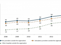 The AHA survey also provides the opportunity to gauge whether hospitals electronically notify a patient’s primary care provider of an emergency room encounter and if the hospital provides patients with the ability to transmit their health information. In 2013, less than half of hospitals routinely electronically notified a patient’s primary care provider inside their system when they entered an emergency room, and roughly one-quarter notified primary care providers outside of their system. Only one in ten hospitals provided their patients with the ability to transmit information from their medical record to a third party.