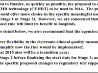 The American Hospital Association urges CMS and ONC to quickly adopt plans that were identified in its Notice of Proposed Rulemaking that would give hospitals flexibility in the combinations of EHR certification and Meaningful Use stages that are permitted for 2014. AHA observes that the proposals are last minute given that the last FY2014 reporting period is July through September 2014 and the NPRM’s comment period won’t be finished until that reporting period is underway, meaning that “hospitals are essentially being asked to act on faith that the agencies will finalize these proposals as written while risking that they may not.” AHA also wants the 2015 reporting period shortened to 90 days and to avoid setting a firm October 2016 start date for MU Stage 3 given that “fewer than 10 hospitals and 50 EPs had attested to Stage 2” as of mid-May.